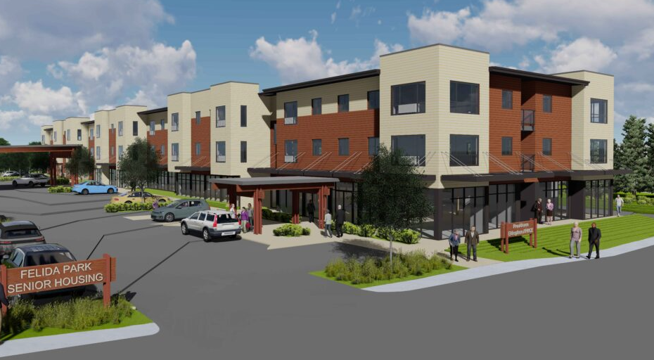 The Felida Park Senior Housing development is a new ground-up, three-story, 65-unit affordable housing project designed specifically for seniors. The development includes a lobby, exercise room, surface parking, a small private garden, as well as a Providence healthcare clinic located on the ground floor, providing convenient access to essential medical services for residents.