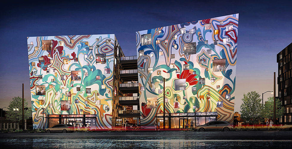 The Fair-Haired Dumbbell is a 55,000 SF mixed-use development located at the East Burnside Bridgehead in Portland. The building comprises two six-story timber-frame structures connected by bridges at each level, creating a distinct "dumbbell" shape when viewed from above. The upper five floors are dedicated to creative office space, while the ground floor features retail space. The building's exterior is adorned with a striking, hand-painted design by renowned Los Angeles artist James Jean, which was transferred to the structure by local artist Dan Cohen. Urban Resources, Inc. served as the Owner's Representative throughout the project, overseeing its completion in the summer of 2017.